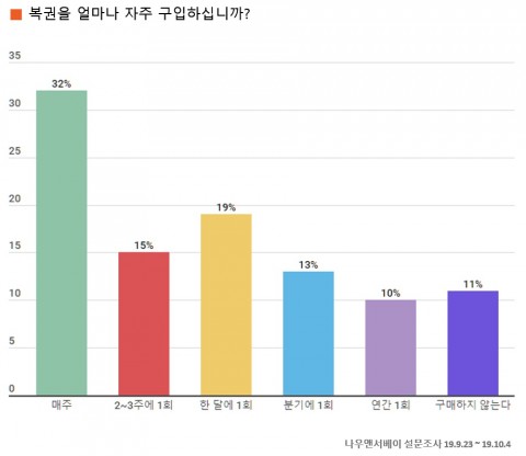‘복권을 얼마나 자주 구입하십니까?’에 대하여 질문한 결과 ‘매주(32%)’가 가장 많은 응답을 차지하였고, ‘2~3주에 1회(15%)’, ‘한 달에 1회(19%)’, ‘분기에 1회(13%)’, ‘연간 1회(10%)’, ‘구매하지 않는다(11%)’ 등으로 응답해, 직장인 66%는 월 1회 이상 복권을 구입하는 것으로 나타났다.