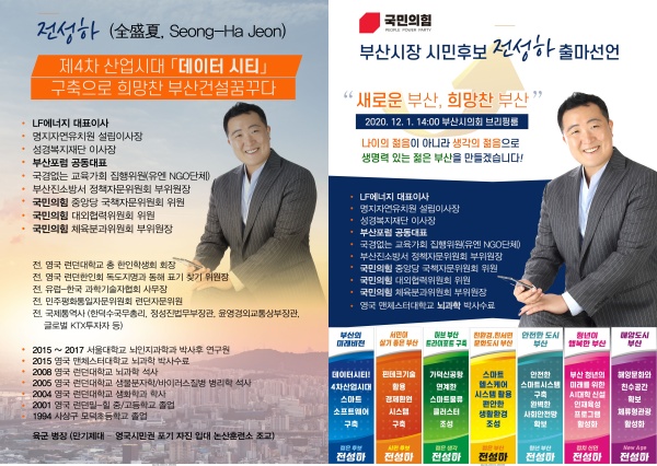 기후환경과 뇌과학 전문가인 LF에너지 대표이사 전성하(40세)씨가 12월 1일 오후 2시 부산시의회 브리핑 룸에서 내년 4월 부산시장 보궐선거에 국민의힘 후보로 출마를 선언할 예정이다.