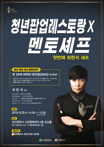 핀연구소는 10월 25일(금요일) 오후 2시에 대구광역시 시민행복센터 2층 상상홀에서 ‘청년팝업레스토랑 × 멘토셰프’ 창업 콘서트를 개최한다.