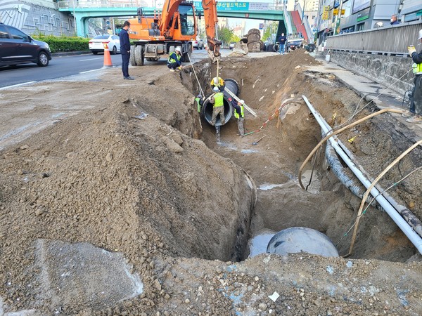 이곳은 3월 31일 오후 5시경 누수가 발생하여 이 날 오후 9시 30경 응급조치를 하였으나, 금일 오전 7시 20분경 물이 고이기 시작하여 교통 통제 후 공사 중이다.