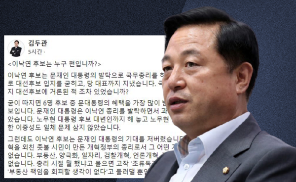 더불어민주당 대선 경선 후보인 김두관 의원은 10일 자신의 페이스북을 통해 “이낙연 후보는 문재인 대통령의 발탁으로 국무총리를 하고 이를 기반으로 대선후보 입지를 굳히고, 당 대표까지 지냈다. 국무총리 이전까지 대선후보에 거론된 적 조차 있었습니까? 굳이 따지면 6명 후보 중 문대통령의 혜택을 가장 많이 받은 복 받은 후보이다. 문재인 대통령은 이낙연 총리를 발탁하면서 과거를 묻지 않았다. 노무현 대통령 후보 대변인까지 해 놓고 노무현 탄핵에 가담한 이중성도 일체 문제 삼지 않았다. 그런데도 이낙연 후보는 문재인 대통령의 기대를 저버렸다. 국정개혁을 외친 촛불 시민이 만든 개혁정부의 총리로서 그 어떤 개혁성과도 없다. 부동산, 양극화, 일자리, 검찰개혁, 언론개혁, 제대로 한 것이 없다. 총리 시절 뭘 했냐고 물으면 고작 ‘조류독감 잡았다’는 것과 '부동산 책임을 회피할 생각이 없다'고 둘러댈 뿐이다”라고 신랄하게 비판했다.