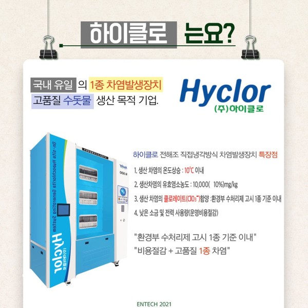 이번 전시회에 특히 눈길을 끄는 제품은 국내유일 조달우수제품인 (주)하이클로사의 안전한 고품질 수돗물 생산에 필요한 전해조 직접냉각방식 차아염소산나트륨 발생장치로, 이 제품은 신기술을 적용하여 정수장, 배수지, 수영장 등 염소 소독이 필요한 수처리 시설에서원료를 안전한 소금으로 저장하고 차염이 필요시 즉시 생산하여 가장 신선한 상태의 1종 차염을 사용할 수 있는 안전하고 유일한 소독방식이다.