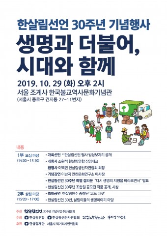 한살림선언 30년을 맞아 한살림연합은 10월 29일(화) 오후 2시 조계사 한국불교역사문화기념관에서 ‘생명과 더불어, 시대와 함께 - 한살림선언 30년’ 기념행사를 개최한다.