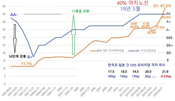 외환위기 이후 우리나라의 국가채무 비율은 올해 47.2%까지 계속 증가했다. 국가신용등급도 11등급이나 올라 외환위기 직전의 AA-보다 한 등급 높은 AA이다. AAA, AA+ 다음 세 번째로 높은 등급이고, 점수로는 90점정도 됐었다.