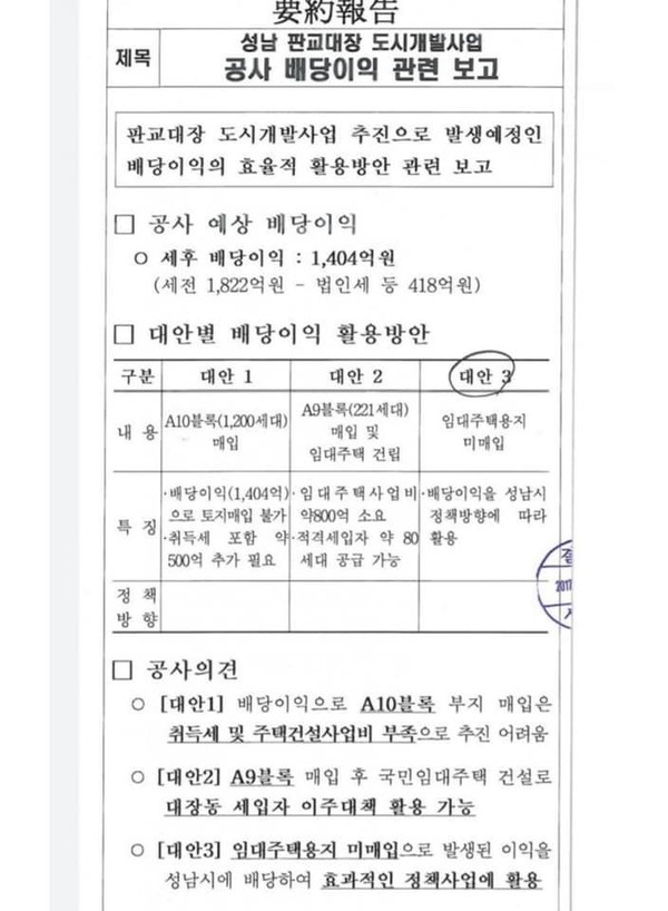 더불어민주당 대선 후보인 이재명 경기도지사는 14일 자신의 페이스북을 통해 “제가 대장동 공영개발 추진하며 성남시민들에게 드린 말씀"이라며 “2700억 들여 본시가지 1공단공원도 만들었고, 920억 드는 터널, 도로 공사도 그들에게 떠맡겨 절감된 예산으로 복지정책 할 수 있었지요. 그런데 이런 건 체감이 잘 안되므로, 환수이익 1,822억은 가구당 5~60만원씩 시민배당해서 ‘정치 잘하면 이익도 생긴다’는 정치효능감을 드리려 했다”라고 밝혔다.