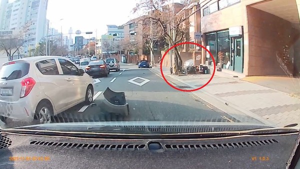 사고는 1차로를 앞서가던 C씨(60대, 남)가 운전하던 모닝 승용차량이 1차로에서 2차로로 진로변경 중 뒤 따라 오던 A군(10대, 학생)이 운전하던 번호판 없는 300CC 오토바이가 모닝차량을 추월하여 가면서 충돌 튕겨나가 인도에 떨어진 사고가 났다.
