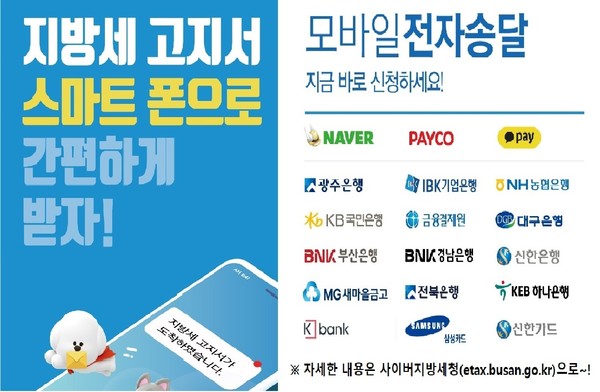 부산은행 등 12개 금융기관 앱과 카카오페이, 네이버페이, 페이코 등에서 전자송달을 신청하면 등록면허세(1월), 자동차세(6월, 12월), 재산세(7월, 9월), 주민세(8월) 전자고지서를 받을 수 있다.