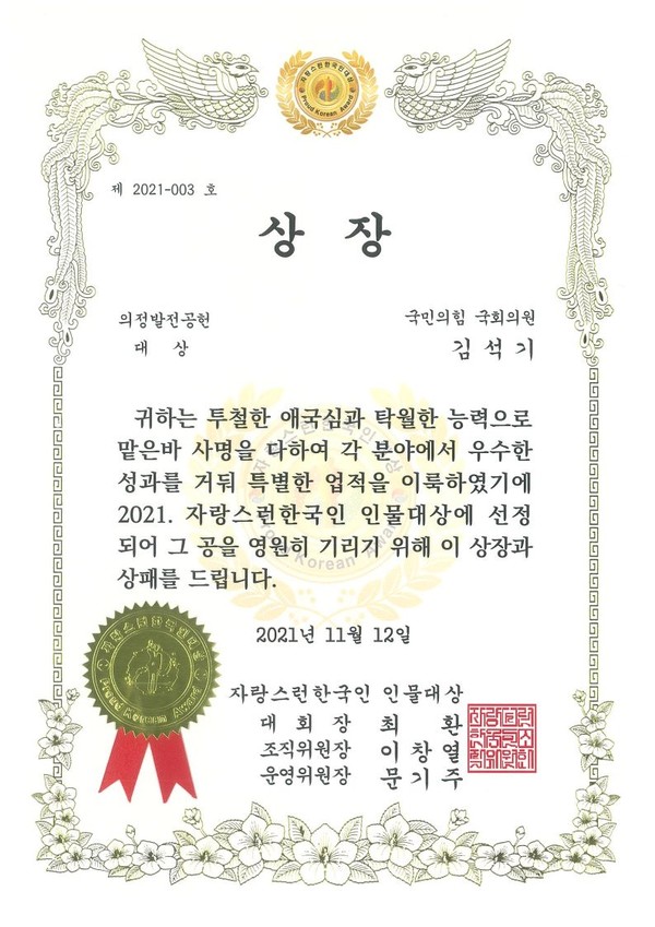 경찰출신 국민의힘 김석기 의원(경북 경주)은 12일 연세대 동문회관에서 열린 2021 자랑스런한국인 인물대상에서 ‘의정발전공헌 대상’을 수상했다.