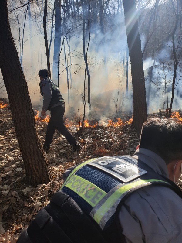 산불발생으로 현재 임야 300미터 가량이 불에 탔다. 소방에서는 통로를 확보 중이며, 경찰은 추가상황을 확인 중에 있다.
