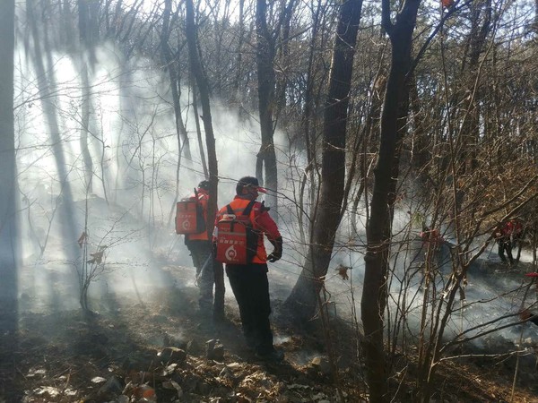 5일 오후 1시 45분경 부산시 사상구 주례동 산74-7 럭키아파트 뒷편 야산에서 산불이 발생했다.