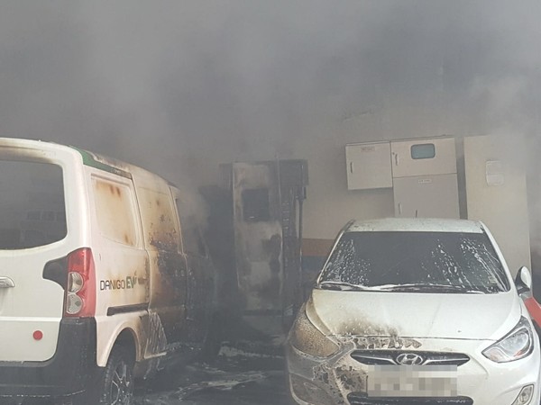 8일 오후 4시 55분경 부산시 동래구 안라동 화목아파트 주차장 전기차 충전기부근 주차해둔 전기차량에서 화재가 발생했다.