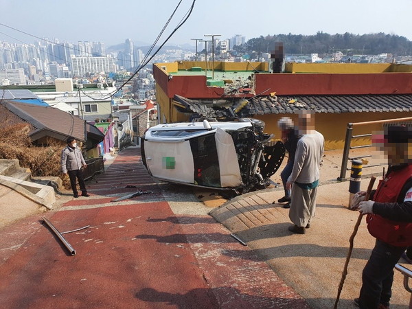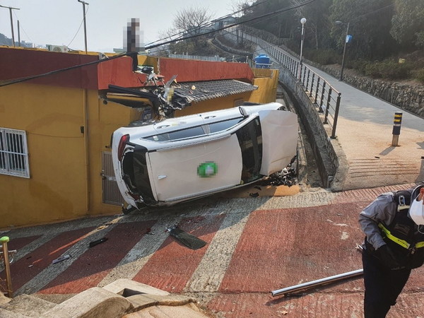 9일 오후 2시 30분경 부산시 동구 보광사 사찰 입구 사거리 주차장에서 개인택시가 추락한 교통사고가 발생했다.