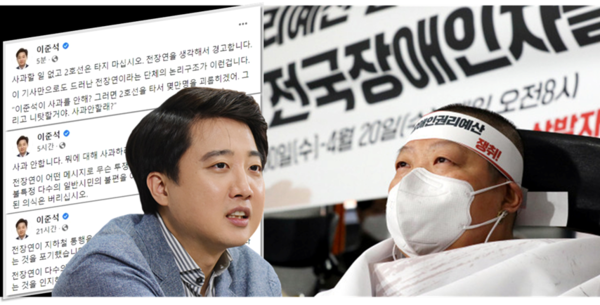 앞서 이준석 국민의힘 대표가 사회관계망서비스(SNS)에 ‘서울시민의 아침을 볼모로 잡고 있다’는 취지로 전장연의 출근길 지하철 타기 시위를 잇달아 때리면서 논란이 불거졌다.