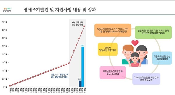 2017~2020년 가족을 중심으로 한 조기중재 프로그램(6개월 개입) 결과를 살펴보면, 장애위험군 영유아 41명 가운데 40명인 98%가 개입 이후 정상 발달 속도 이상의 발달을 보였으며 사전-사후 검사에서 정상에 근접하거나 정상범위의 발달은 보인 영유아는 36명으로 88%에 달했다. 6개월 개입만으로도 그 효과성이 입증된 것이다.