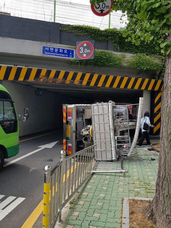 7일 오전 9시 58분경 부산진구 서면문화로 53 부전고가교 밑을 지나가던 고소작업차가 부전고가교 천장에 부딪혀 우측으로 넘어지는 교통사고가 발생했다.