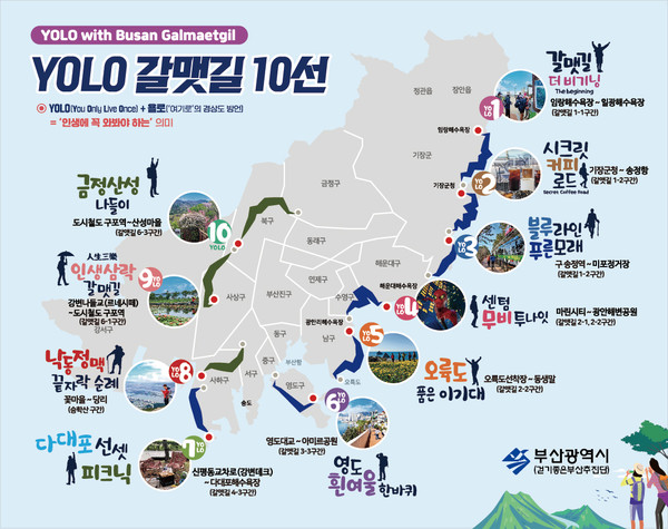 ‘YOLO 갈맷길’은 부산에 오면 꼭 걸어봐야 하는 걷기 여행길로, 코스당 반나절 이내로 완주할 수 있는 관광객 맞춤형 코스다. 해안코스 7개, 강변코스 1개, 산행코스 2개 등 총 10개 코스로 구성돼 바다와 산, 그리고 도심이 아름답게 공존하는 부산만의 특색있는 정취를 느낄 수 있다.