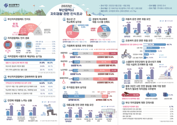 정용환 부산시 자치경찰위원장은 “자치경찰제에 대한 시민들의 기대감과 인식도가 높아진 것은 매우 긍정적이나 일상생활과 밀접한 다양한 분야에서 시민들의 우려가 여전한 만큼 이번 인식조사를 바탕으로 더욱 다양한 맞춤형 치안 정책을 추진하여 시민 만족도를 획기적으로 높여 나가겠다”고 전했다.