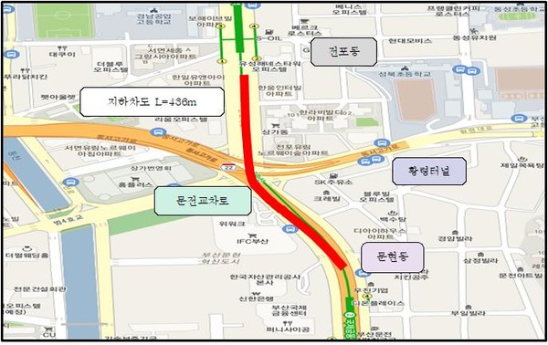 이번에 개통하는 문전지하차도는 부산진구 ‘전포지구대’에서 남구 ‘부산국제금융센터’를 통과하는 총길이 436m의 편도 2차로 지하차도로, 총사업비는 282억 원(국비 138, 시비 144)이 투입됐다.