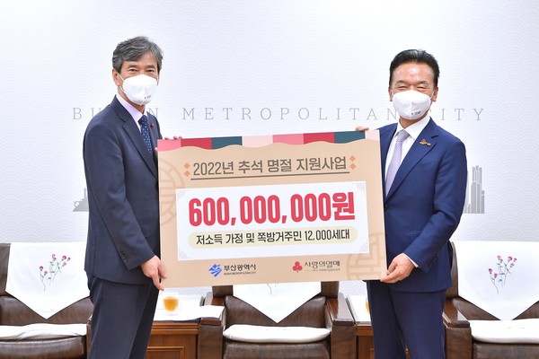 부산사회복지공동모금회(회장 최금식)는 저소득 취약계층 및 쪽방 상담소 거주자 1만2천여 세대에 세대당 5만 원씩, 총 6억 원 상당의 명절 지원금을 지원한다.