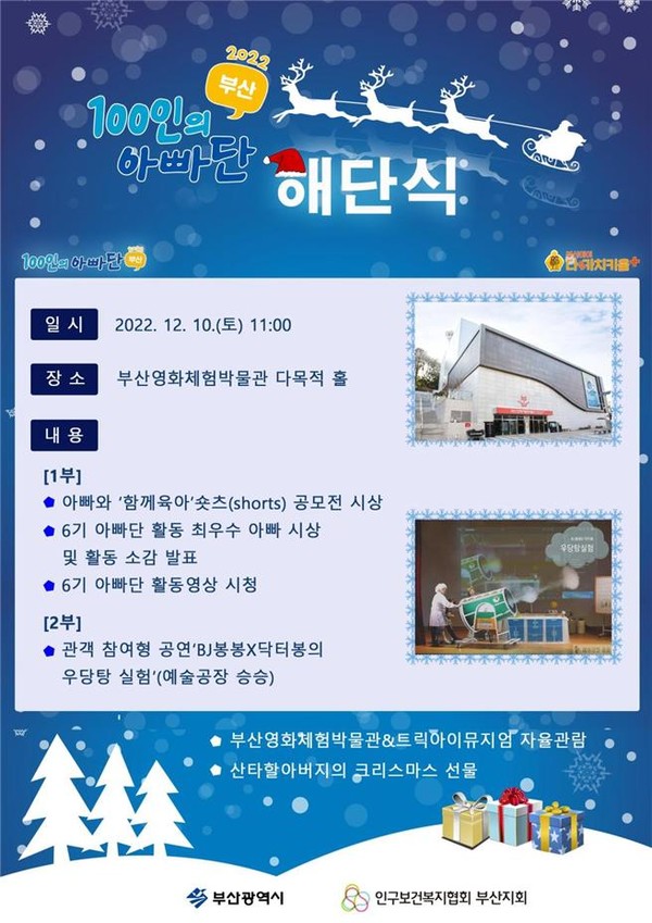 부산시는 내일(10일) 오전 11시 부산영화체험박물관에서 아빠들의 신나고 즐거운 육아 동행 활동 마무리를 위한 ‘100인의 부산 아빠단 6기 해단식’을 개최한다고 밝혔다.