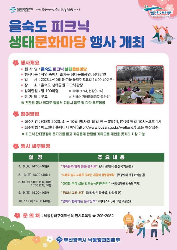 부산시 낙동강관리본부는 봄․가을 둘째 주 토요일 오후 2시, 주말 을숙도 생태공원으로 나들이 나온 시민 및 관광객을 대상으로 자연생태와 어울리는 다양한 생태․문화행사를 개최한다고 밝혔다.