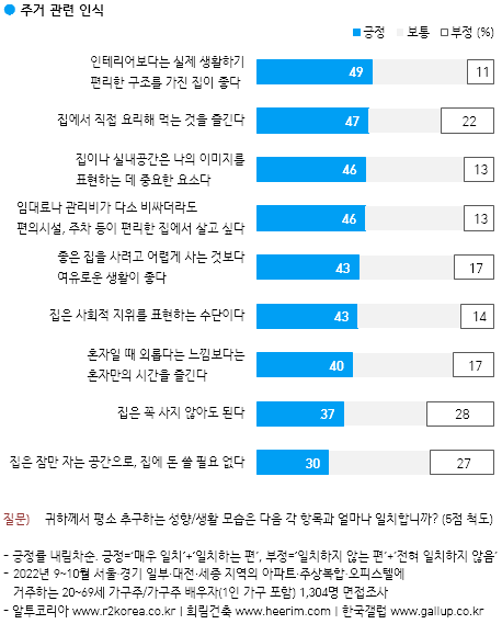 한국갤럽이 알투코리아·희림건축 의뢰로 2022년 9~10월 서울, 경기도 일부 지역, 대전·세종의 아파트·주상복합·오피스텔에 거주하는 20~69세 가구주/가구주 배우자 1,304명에게 주거 관련 여러 항목에 대해 평소 자신이 추구하는 성향/생활 모습이 얼마나 일치하는지 물었다(5점 척도).