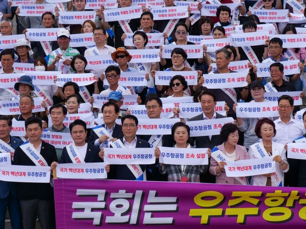 우주항공청법안 통과를 촉구하는 국민의힘 국회의원 일동은 지난 27일 국회 앞에서 ‘우주항공청법안 통과촉구’ 성명을 발표하고 '국가백년대계 우주항공청 조속설립'이라고 쓰인 피켓을 들고 시위를 벌였다.