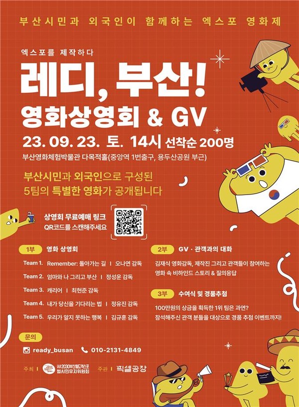 이날 `엑스포 영화제 레디,부산!` 행사는 부산시민이면 누구나 무료로 참석이 가능하며, 네이버예약(레디,부산! 상영회&GV) 또는 현장방문(문의 : 010-2131-4849)으로 참석이 가능하다.