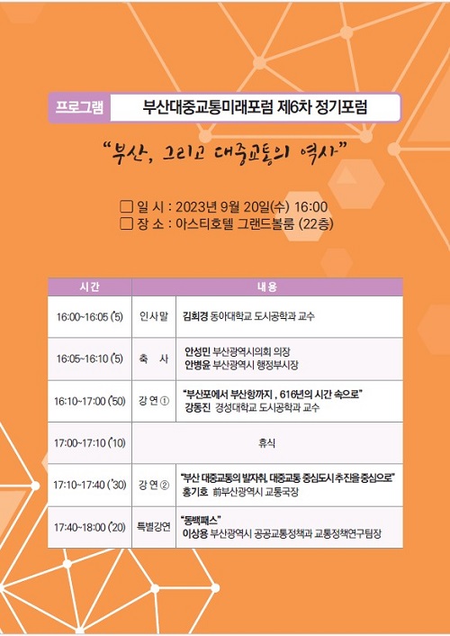 이번 정기포럼은 특정 주제를 가지고 하는 발제와 토론의 장이 아닌 미래 대중교통을 준비하기 위해 부산의 역사와 그와 함께 걸어온 대중교통의 발자취를 되새겨 보는 강연으로 진행된다.
