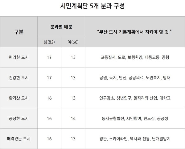 참고로 시민계획단은 총 174명(시민 148명, 퍼실리테이터 20명, 분과위원장 5명, 총괄계획 1명)으로, 부산시민을 대상으로 공모를 통해 전문가인 총괄계획가, 분과위원장 위촉, 퍼실리테이터를 선정하고, 성별, 연령, 분과 우선순위별 안배를 통한 5개 분과를 구성하였다.