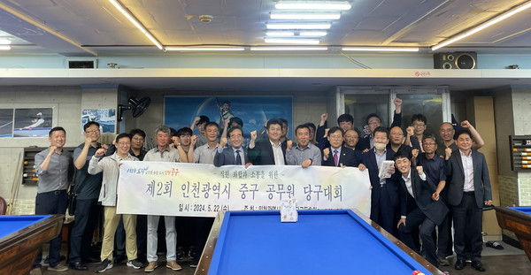 24일 인천 중구에 따르면, 지난 22일 저녁 중구 원도심 소재 모처 당구장에서 열린 이번 대회는 활기찬 직장 분위기 조성과 조직 소통강화를 위해 인천 중구청 공무원 당구 동호회가 주관한 자리다.