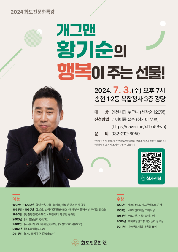 인천 동구 화도진문화원(원장 조장환)은 오는 7월 3일 송현1·2동 복합청사 3층 강당에서 <개그맨 황기순의 행복이 주는 선물> 특강을 개최한다고 밝혔다. 2024 화도진문화특강은 이번이 두 번째다.
