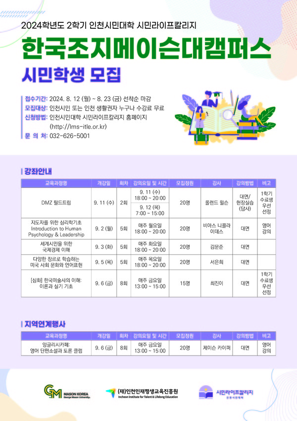 한국조지메이슨대학교(George Mason University Korea)는 인천인재평생교육진흥원과 협력해 2024학년도 2학기 인천시민대학 시민라이프칼리지 한국조지메이슨대캠퍼스 시민학생을 모집한다고 7일 밝혔다.