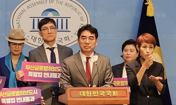 국민의힘 이성권 의원은 4일 오전 국회 소통관에서 열린 '부산 글로벌허브도시 특별법 조속 입법 촉구' 기자회견에 참석하여 이 법안이 빠른 시일 내에 입법될 수 있도록 법안의 필요성에 대해 강력히 주장했다.