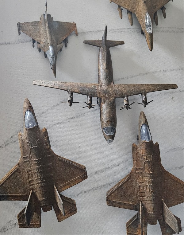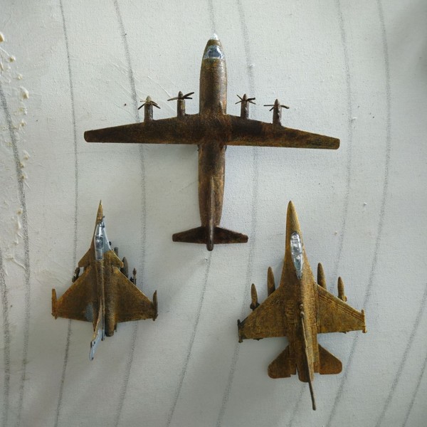 이삼술 작가는 전쟁의 참화와 참상의 아픔을 낡고 녹슨 모형 장난감처럼 보이는 비행기와 잠수함을 통해 표현한다.