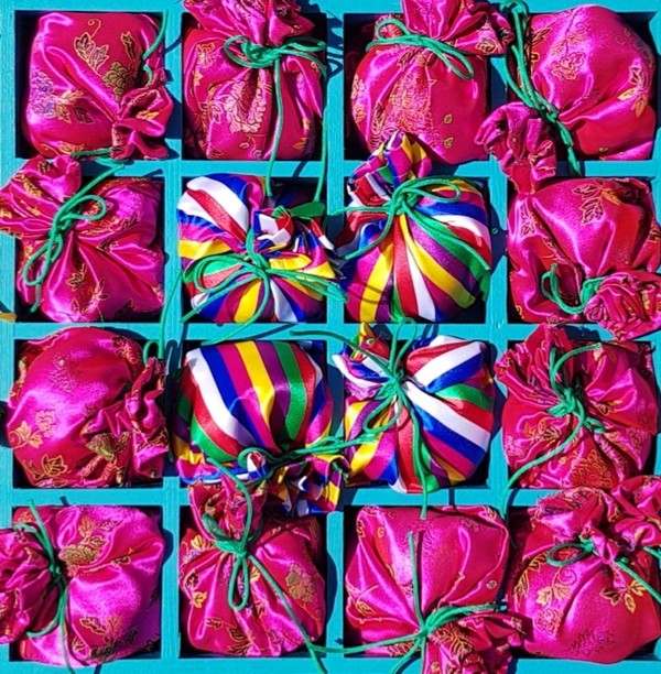 그의 복주머니 작품은 규방여인들의 손바느질 자수솜씨와 한국의 고유 염색기술이 깃든 오방색의 찬란한 자태를 보여주고 있다.