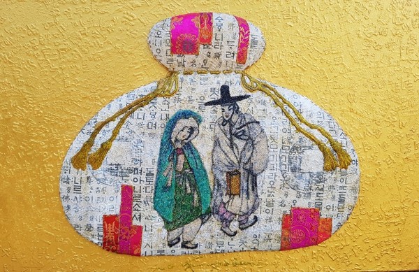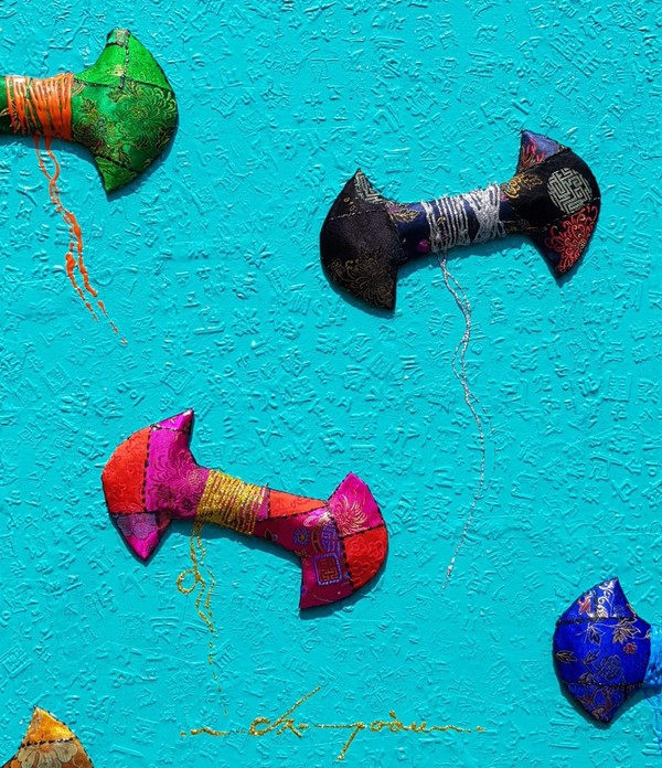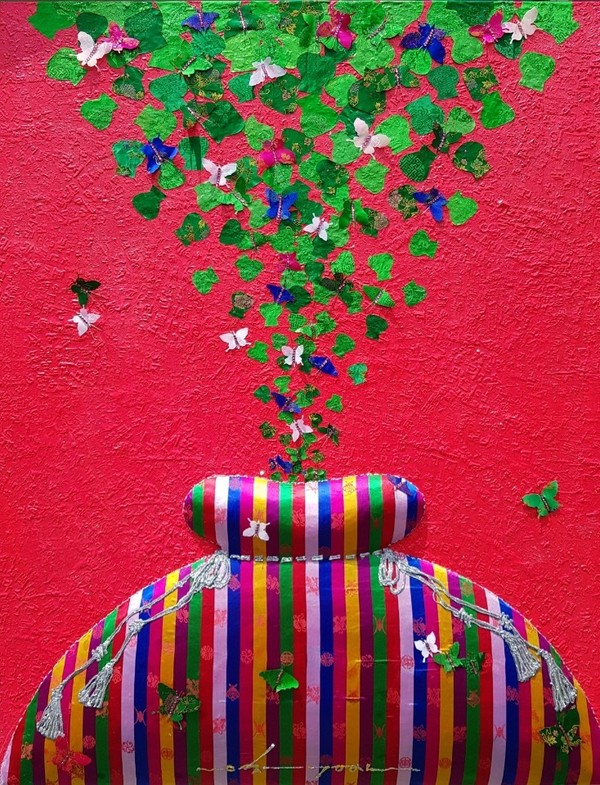 이정효 작가는 복주머니를 통해 한국 전통 자수와 오방색의 아름다움을 입체적으로 표현하고 있다. 한지와 실크를 사용해 평면그림 위에 실제 복주머니가 올려 진 듯한 입체적 형상을 만들어내며, 복을 '받는다’는 개념을 넘어 ‘짓고’, ‘나누는’ 의미를 담고 있다.