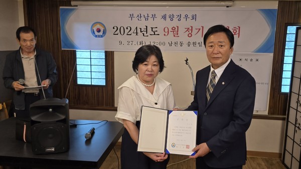 신임 강유복 자문위원은 임상병리사. 사회복지사. 요양보호사. 소방안전관리사1급 등 자격증을 보유한 재원으로 진주간호전문대학를 졸업, 1986년부터 지난 2017년까지 침례병원에 근무하고 20223년도부터는 삼환골든뷰 에듀스테이션 관리소장으로 근무중에 있다. 유일한 홍일점 여성자문위원으로 가입한 강유복 신임 위원에게는 위촉장 및 회원증, 경우회 뺏지를 전달했다.