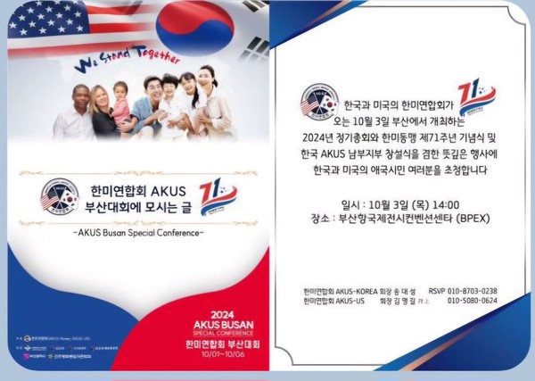 한미연합회(회장 송대성·김영길) 주최로 10월 3일 오후 2시 부산항국제전시컨벤션센타에서 2024년 정기총회와 한미동맹 제71주년 기념식 및 한국 한미연합회 남부지부 창설식을 개최한다고 밝혔다.