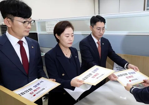 국민의힘 박준태, 서지영, 박충권 의원이 14일 오후 서울 여의도 국회 의안과에 부적절한 발언으로 논란이 된 더불어민주당 김영배, 양문석, 장경태 의원 등 민주당 막말 3인방 징계안을 제출했다고 밝혔다.