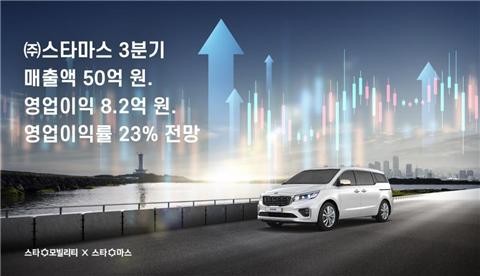 지난달 스타모빌리티로 흡수합병되어 렌터카 비즈니스를 메인으로 제주도 렌터카 공유 관리(위탁) 사업을 진행 중인 스타마스의 올해 3분기 매출액은 약 50억, 영업이익은 약 8.2억을 기록할 것으로 전망됐다.