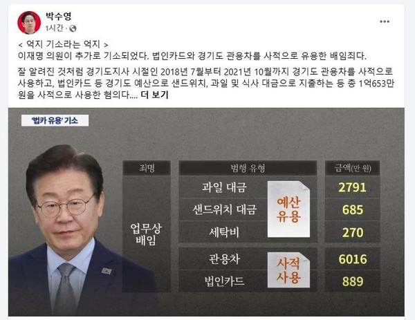국민의힘 박수영 의원(부산 남구)은 20일, 이재명 의원이 법인카드와 경기도 관용차를 사적으로 유용한 혐의로 추가 기소된 것에 대해 입장을 밝혔다.