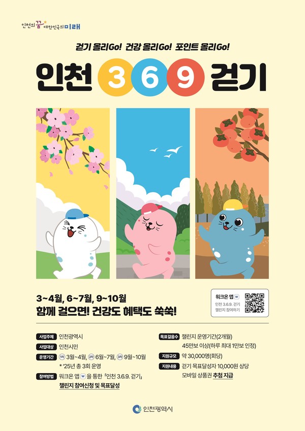 ‘인천 3.6.9. 걷기’는 3월, 6월, 9월 총 3회에 걸쳐 회차별 2개월 동안 진행된다. 참여를 원하는 시민은 모바일 애플리케이션 ‘워크온’에서 회원 가입 후 신청할 수 있다.