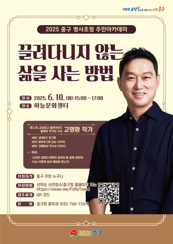 인천시 중구는 오는 6월 10일 오후 3시 하늘문화센터에서 방송인이자 작가인 고명환과 함께하는 무료 특강 ‘2025 중구 명사초청 주민아카데미’를 개최한다고 밝혔다.