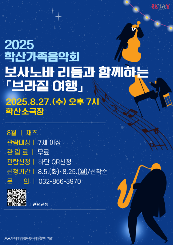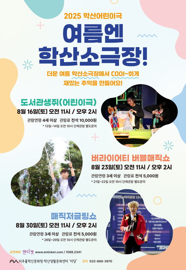 미추홀학산문화원은 오는 8월, 지역 주민을 위한 기획공연을 선보인다. 가족 단위 관객을 위한 학산가족음악회와 여름방학을 맞이한 어린이들을 위한 학산어린이극 시리즈가 각각 진행되며, 학산소극장에서 누구나 문화예술을 즐길 수 있는 한 달을 만들어갈 예정이다.