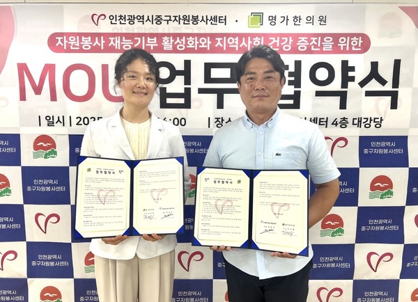 인천중구자원봉사센터(센터장 최윤호)는 지난 18일 명가한의원(원장 김서휘)과 중구자원봉사센터 4층 대강당에서 ‘자원봉사자 및 지역사회 건강 증진을 위한 업무협약’을 체결했다고 밝혔다.