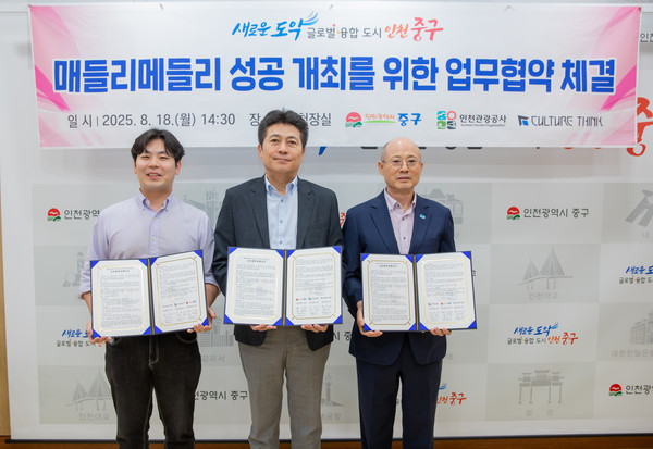 인천시 중구(구청장 김정헌)는 인천관광공사(사장 백현), 컬쳐띵크㈜(대표 김진겸)와 이러한 내용을 담은 ‘매들리 메들리 페스티벌 2025의 성공적 개최를 위한 업무협약(MOU)’을 체결했다고 21일 밝혔다.