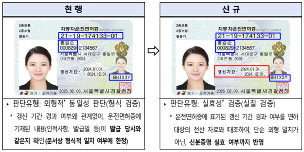 현재 갱신 기간 경과 여부 관계없이 운전면허증 기재 내용만 발급 당시와 같은지 여부를 판단하여 ‘일치’로 안내하고 있으나 앞으로는 갱신 기간 경과 여부까지 확인할 수 있도록 시스템이 개선된다.