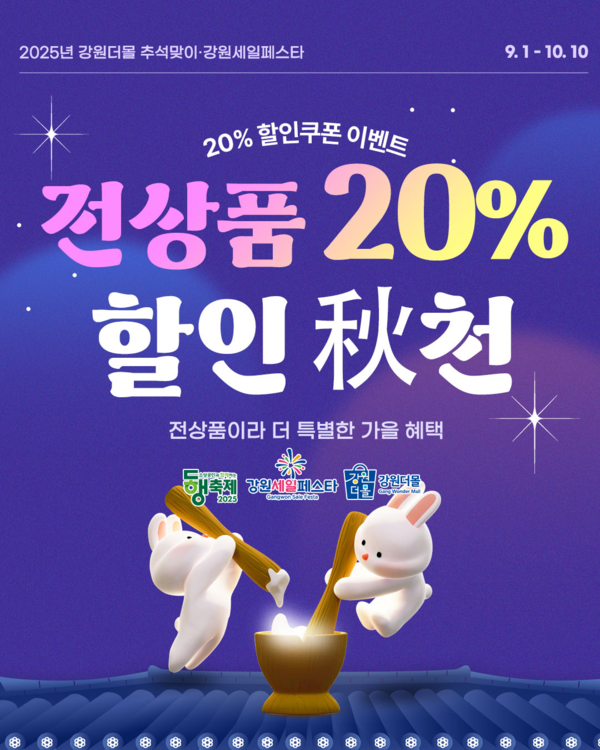 강원특별자치도(도지사 김진태)의 대표 온라인 쇼핑몰 ‘강원더몰’(www.gwdmall.kr)이 2025년 추석을 맞아 ‘동행축제· 강원세일축제(페스타)’와 함께 9월 1일부터 10월 10일까지 40일간 ‘추석맞이 기획전’을 개최한다. 이번 기획전은 입점 기업의 매출 확대와 소비자의 합리적인 명절 쇼핑을 지원하기 위해 기획됐다.