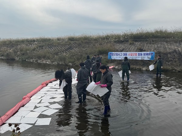 주요 훈련 사항은 ▲상황반 사고 접수 및 상황 전파 ▲인근 유관기관에 방제 협조 요청 ▲방제반 방제 작업 실시 ▲오염조사반 시료 채취 ▲자갈·수로변에 부착된 기름 제거 ▲폐기물 회수 등이다.